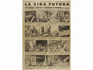 1936. AGUADO, VICTOR ?: LA VIDA FUTURA. Programa historieta Cines Coliseum y Fémina de Barcelona. Película de Alexander Korda sobre la obra de H. G. Wells. Tamaño 22 x 32 cm. Buen estado. Dibujos de Víctor Aguado?.