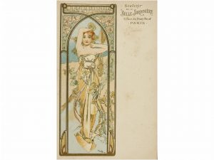 1900 ca. MUCHA, ALPHONSE: BELLE JARDINIÈRE. Postal ilustrada por Alphonse Mucha. Buen estado.