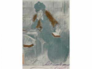 1902. CASAS, R.: MUJER CON LIBRO. Postal ilustrada, circulada. Pel & Ploma Núm. 2. Muy buen estado. Realizada por Ramón Casas.