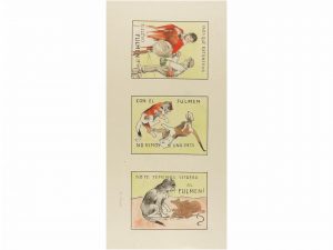 1900 ca. EULOGIO VARELA: PUBLICIDAD. Tres dibujos originales color en sola una lámina con anuncios de raticida Fulmen. Firmados E. Valera. Tamaño 26 x 37 cm.