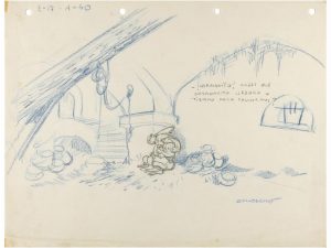 1945. ARTURO MORENO: GARBANCITO DE LA MANCHA. Conjunto de 10 bocetos originales de Arturo Moreno para la película de animación Garbancito de la Mancha (1945), primer largometraje de dibujos animados en color de Europa. Documento histórico.