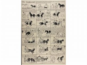 1950 ca. TINEZ: EL CABALLO MALDITO. Página interior. Dibujo original para el Semanario TBO. Tamaño soporte 39 x 26,5 cm. Autor Juan Martínez Buendía, Tinez.