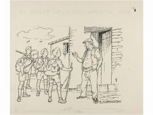 1968 ca. (COMIC). BATLLORI JOFRE, A.: A: BATLLORI JOFRÉ. 2 PORTADILLAS ORIGINALES (PATUFET). Barcelona. Editorial Baguna. 23 x 19,5 y 20,5 x 24,5 cm. Dibujos pluma. Portadillas interioresde los relatos El taller de la descubertas y L´endivinaire....