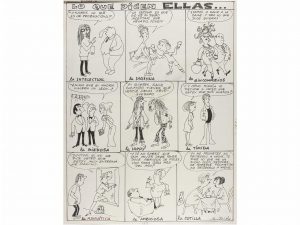 1970 ca. MUNTAÑOLA, JOAQUIN: LO QUE DICEN ELLAS. Página interior. Dibujo original. Corresponde al cuaderno Nº 779 del Semanario TBO. Tamaño soporte 33 x 25 cm.