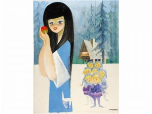 1970 ca. MORENO, ARTURO: BLANCANIEVES Y LOS 7 ENANITOS. Portada Color. Ilustración original para cuento. Tamaño soporte 41 x 32 cm.