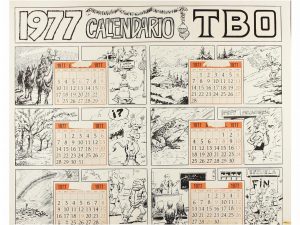1977. TOLEDANO, BERNET: CALENDARIO TBO 1977. Página interior. Dibujo original de Bernet Toledano para el Semanario TBO. Tamaño soporte 58 x 40 cm.