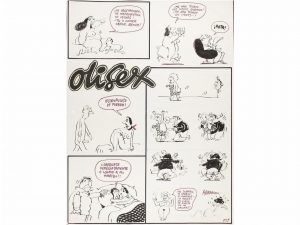 1985 ca. OLI: CONJUNTO DE 20 HOJAS CON ORIGINALES DE LA SECCION OLISEX, PUBLICADA EN LA REVISTA PAPUS. Tinta sobre papel montados en cartoné de 44x33 cm. Varias viñetas en cada hoja.