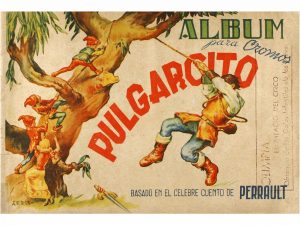 1944 ca. PERIS ARAGO: PULGARCITO, ÁLBUM PARA CROMOS. Completo, 108 cromos. Editado por Aguilar (Valencia) Ilustración portada de Peris Aragó. Señales de uso. Pequeña reparación con celo en la parte inferior del lomo.