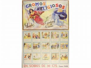 1940 ca. CROMOS RELIGIOSOS FHER. Rarísimo cartel anunciador de la colección de Cromos Religiosos. 34 x 50 cm. Litografia A.