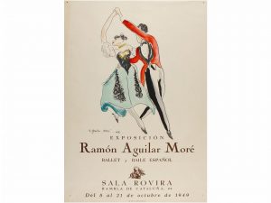 1949. EXPOSICIÓN RAMÓN AGUILAR MORÉ. Cartel de la Exposición del pintor en la Sala Rovira de Barcelona. Coloreado a mano supuestamente por el propio artista. Tamaño 25 x 35 cm. (10 x 13 in.) Muy buen estado.
