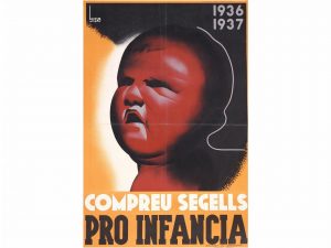 1937. (GUERRA CIVIL Y REPUBLICA). BADIA VILATO: COMPREU SEGELLS PRO-INFANCIA. Barcelona: Rieusset. Litografía. 98x67,5 cm. (38,6x26,6 in.). A -. Dobleces de pliego.