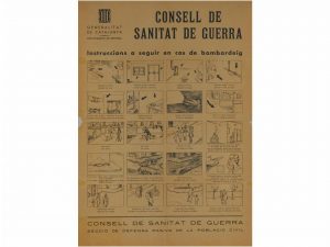 1937 ca. (GUERRA CIVIL-AUCA). CONSELL DE SANITAT DE GUERRA. INSTRUCCIONS A SEGUIR EN CAS DE BOMBARDEIG. 55x38,5cm. (27,7x15,2in.). Litografía. B. Alguna falta de papel periférica.