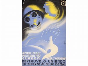 1937 ca. VILATO, BADIA: AMBICIONES, MILITARISMO, GUERRA. ESTO ES EL FASCISMO. Cartel 74 x 110 cm. (29 x 43 in.) Entelado B-. Restauración ángulo superior derecho y pequeñas fisuras perte superior.