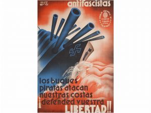 1937 ca. GARCIA ESCRIBA: ANTIFASCISTAS; LOS BUQUES PIRATAS ATACAN NUESTRAS COSTAS. Cartel 68 x 100 cm. (27 x 39 in.) Guerra Civil. Litografia B. Mínimas restauraciones en bordes. Realizado por García Escribá.