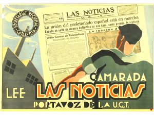 1938. (GUERRA CIVIL Y REPUBLICA). CAMARADA LEE LAS NOTICIAS. PORTAVOZ DE UGT. Litografía. 70x100 cm. (27x40 in.). B +. Pérdida de papel en el margen superior izquierdo.
