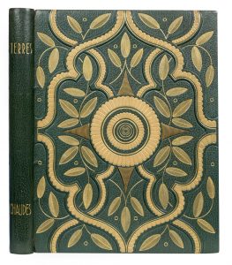 E.O. L’un des 129 ex sur Vélin, seul tirage. Ex signé par l’artiste et préface inédite de L.P FARGUE. Reliure in-4 plein maroquin vert avec sur le premier plat un impressionnant décor de fleurs en spirale flamboyantes en or, dos lisse, tête dorée, couvertures conservées, étui et chemise de demi maroquin