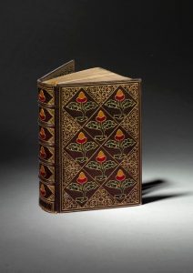 décorés aux petits fers, semis de glands de maroquin vert, rouge et jaune mosaïqué couvrant les plats, dos orné de même, doublures de maroquin vert ornées d'une large dentelle aux petits fers, tranches dorées, étui de chagrin brun aux plats ornés de filets losangés (Gruel, 1855).