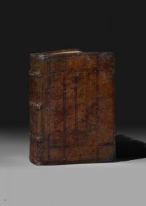 grandes et petites rosaces et de fleurs de lis à froid, dos à trois gros nerfs orné de filets, traces de fermoirs en cuivre au second plat, tranches lisses (Reliure de l'époque).