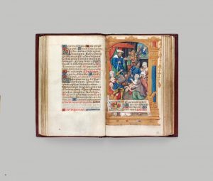 Précieux manuscrit parisien du début du xvie siècle orné de quatorze grandes miniatures et trente petites et d'initiales peintes, avec la lettre en blanc ou bleu sur fond doré ou à l'or sur fond bleu. # Contenu : Tabula pascalis du 20 avril 1506 au 19 avril 1530 (f. 1v) ; calendrier en latin (ff. 2-9) ; péricopes des évangiles (ff. 9v-13) ; Passion (ff. 13v-20) ; Heures de la Vierge à l’usage de Rome avec les Heures de la Croix et du Saint-Esprit intercalés (ff. 20v-64) ; Psaumes de la pénitence suivis des litanies avec saint Loup (ff. 65-76v) ; Office des morts à l’usage de Rome (ff. 77-95) ; Suffrage de la Trinité, Obsecro te suivi du O intemerata, Stabat Mater, Des 15 joies de la Vierge Ave cuius conceptio solemni plena, les 7 oraisons de S. Grégoire, O domine Iesu Christe adaro te in cruce pendentem, Suffrages des saints, De sorobibus beate Marie (ff. 95v-116) ; Missus est Gabriel angelus, Te deprecor ergo mitissimam, Oraison pour garir des fievres, et d’une autre main : Quiconques dira ces 3 oraysons gagnera XV mille ans de pardon O gloriosa regina, s’ensuit 5 belles oraysons que monseigneur saint Jean l’évangéliste fist en l’honneur de la Vierge Mediatrix omni et fons vivis (ff. 118-125). Les ff. 64v et 125v-126 sont blancs. # Quatorze grandes miniatures peintes dans des cadres Renaissance animés de putti : Le Christ au mont des oliviers avec les apôtres endormis (f. 13v) – Annonciation (f. 20v) – Visitation (f. 30v) – Crucifixion à grand spectacle (f. 37v) – Pentecôte, où la Vierge siège au centre du cénacle (f. 38v) – Nativité (f. 39v) – Annonce aux bergers (f. 43) – Adoration des mages (f. 46), où l’un des mages est noir – Présentation au Temple, où une servante tient un panier de tourterelles, avec une foule de clercs assistant à la scène (f. 49) – Massacre des innocents, avec à l’arrière plan la fuite en Égypte (f. 52) – Couronnement de la Vierge par le Christ et Dieu le père, avec une nuée de séraphin au centre et un plafond à caisson (f. 55v) – David et Bethsabée au bain avec une servante, où David est à la fenêtre d’un hôtel et d’autres personnages apparaissent aux autres fenêtres (f. 65) – Résurrection de Lazare, avec une jolie vue sur une ville à travers la fenêtre (f. 77) – Trinité (f. 95v). # Trente petites miniatures accompagnées de belles bordures sur fond de couleur avec des fleurs, troncs écotés, sur fond d’or, compartimentées sur fond de parchemin, avec des treillis : saint Jean sur l’île de Patmos (f. 9v) – saint Luc peint le portrait de la Vierge (f. 10v) – saint Mathieu et l’ange (f. 11) – saint Marc et le lion (f. 12) – le Christ devant Pilate (f. 15v) – le Christ devant Caïphe (f. 17) – Portement de Croix (f. 18) – Crucifixion (f. 19) – Vierge au voile bleu en prière, inspirée d’un tableau de Jean Bourdichon (f. 96) – Piétà (f. 100) – saint Michel (f. 104v) – saint Jean Baptiste (f. 105) – saint Jean l’évangéliste (f. 105v) – saint Jacques (f. 106) – saints Laurent et Christophe (f. 106v ) – saint Georges (f. 107v) – saint Sébastien (f. 108v) – saint Nicolas (f. 109 ) – saint Claude (f. 109v) – saint Antoine (f. 110) – saint Antoine de Padoue (f. 110v) – saint Denis (f. 111) – saint Roch (f. 111v) – saints Cosme et Damien (f. 112) – sainte Anne apprend à lire à la Vierge (f. 112v) – sainte Marie-Madeleine (f. 113) – sainte Catherine (f. 113v) – saintes Geneviève et Marguerite (f. 114) – sainte Barbara (f. 114v) – sainte Appoline (f. 115v). # Six miniatures sont l'œuvre d'un enlumineur influencé par Jean Pichore (ff. 9v, 10v, 11, 20v, 37v, 112). Jean Pichore, enlumineur célèbre en son temps, est connu par deux manuscrits documentés : une Cité de Dieu enluminées pour le cardinal Georges d'Amboise, et des Chants royaux du Puy Notre-Dame d'Amiens réalisés à la demande de Louise de Savoie, vers 1517-1518. Il est également conu comme imprimeur avec Rémy de Lasitre et comme dessinateur de modèles aux gravures sur cuivre parisiens par deux éditions imprimées de 1503 et 1504. Il s'inspire des graveurs germaniques comme Dürer et Schongaeur et des graveurs italiens pur ses bordures. Parmi les enlumineurs, il cite régulièrement Jean Poyer. # Onze miniatures reviennent au Maître du Romuléon de Cluny (ff. 15v, 18, 19, 96, 104v, 105, 109, 110, 110v, 111, 112v). Cet enlumineur a été nommé ainsi par François Avril d'après les fragments dispersés d'un Romuléon dans la traduction de Jean Miélot, peut-être commandé par René II de Lorraine. Le musée de Cluny conserve, de son œuvre, la seule peinture en pleine page connue à ce jour et une plus petite ; six miniatures on été retrouvées au musée municipal de l'Evêché, musée de l'Email de Limoges. # L'artiste a enluminé de nombreux vélins pour le roi Charles VIII, la plupart imprimés pour Antoine Vérard, ce qui nous permet de savoir que l'enlumineur exerce jusque vers 1495, date à laquelle on repère sa main sur un Miroir historial de Vincent de Beauvais. # Ses paysages sont doucement dégradés de bleus. Le peintre rythme les plans par de petites rangées d'arbres en forme de boules. Les plis sont fortement appuyés, les chevelures raides donnent une impression de masse. Des personnages ont un regard étrange, dû à une abondance de blanc dans l'oeil, d'autres ont les paupières gonflées et rouges. On remarque dans sa palette du bordeaux, du rouge, du rose, du vert olive et du marron. Son style le plus pur, non retouché par Pichore, se trouve ici dans les Suffrages. # La très belle Vierge au voile bleu (voir reproduction) dérive d'un modèle de Jean Bourdichon récemment acquis par le musée de Cluny et dont on connaît huit prototypes parisiens. L'enlumineur reprend avec exactitude la draperie du voile de la Vierge. # Enfin, vingt-trois miniatures peuvent être attribuées au Maître de Jean d’Albret (ff. 12