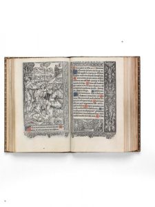 Précieux livre d'heures gothique imprimé sur peau de vélin et enluminé d'initiales dorées sur fond rouge et bleu. # Chef-d'œuvre de la gravure sur bois du début du XVIe siècle, la riche illustration de l'ouvrage se compose de la belle marque de Guillaume Eustace sur le titre, de la figure de l'Homme anatomique (f. 2r) et de seize grandes figures à pleine page – représentant le Martyr de saint Jean (f. 8v), le Baiser de Judas (f. 12v), l’Annonciation (f. 28v), la Visitation (f. 39v), la Crucifixion (f. 47r), la Pentecôte (f. 48r), la Nativité (f. 49r), l’Annonce aux bergers (f. 52v), l’Adoration des mages (f. 55v), la Présentation au temple (f. 59r), la Fuite en Égypte (f. 62v), le Couronnement de la Vierge (f. 68r), David et Bethsabée (f. 78v), la Purification (f. 79r), la Résurrection de Lazare (f. 91r), la Trinité (f. 113r) – et de vingt-cinq portraits de saints et d'évangélistes dans le texte, de moindre format. # Chaque page est encadrée de magnifiques bordures historiées, représentant des scènes tirées des Écritures ou de la vie quotidienne à la fin du Moyen Âge : cueillette des fruits, joueurs de flûte, chasseurs, etc., ou bien ornementales, au grâcieux décor de rinceaux et de grotesques. L'extrême finesse de certaines compositions à fond criblé pourrait faire penser qu'elles ont été gravées sur métal. # Brunet ne cite qu'un seul exemplaire de ce livre d'heures, sensiblement plus court de marges que le nôtre (177 mm), qui passa de la collection Firmin-Didot (1879, n°123) à celle de Thomas Brooke et se trouve de nos jours conservé à l'université d'Oxford. Le seul autre exemplaire référencé dans les collections internationales est celui de la bibliothèque de Liverpool. # En fin de volume, cinq feuillets de vélin et de papier contenant un livre de raison manuscrit du XVIe siècle ont été ajoutés à l'ouvrage. # Très bel exemplaire, grand de marges, d'un remarquable état de fraîcheur, dans une jolie reliure du xixe siècle en maroquin bleu nuit, provenant de deux des plus illustres collections anglaises. # Des bibliothèques Frances Mary Richardson Currer (1785-1861), « head of all female book collectors in Europe » selon T. F. Dibdin, avec ex-libris, et Henry Huck Gibbs (1819-1907), baron d'Aldenham, directeur de la Banque d'Angleterre, avec ex-libris manuscrit à Saint Dunstan's (Londres) en 1864 et ex-libris gravé à Aldenham House dans le Hertfordshire (cat. privé, 1888, p. 87). # Infime piqûre de ver dans les huit premiers feuillets. # Brunet, V, 1646, n°288 – Bohatta, I, n°919 – pas dans Lacombe – Moreau, 1509-104 – Adams, L-1018.