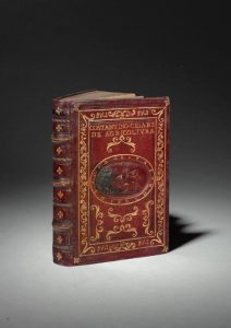 (155 x 100 mm), maroquin rouge, bordure de feuillage et rinceaux dorés cernés de filets dorés et à froid et de petites fleurs de lis dorées aux angles, nom de l'auteur et titre dorés dans la partie supérieure des plats, décor de fers recourbés dorés dans la partie inférieure, médaillon ovale au centre estampé en relief et peint, à l'imitation d'un camée, représentant Apollon sur le char du Soleil et Pégase, ceint de l'inscription grecque ορθως και μηλοξιως en lettres dorées, dos orné de huit fleurs de lis, hachures sur les coupes, tranches dorées (Reliure de l'époque).