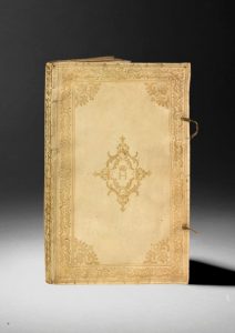 d'angelots et vasques dorées cernée de triples filets, vasques de laurier et fleurs de lis aux écoinçons, chiffre couronné dans un médaillon central de laurier, angelots et fleurs de lis, dos lisse fleurdelisé, tranches dorées, traces de ruban vert d'attache (Reliure de l'époque).