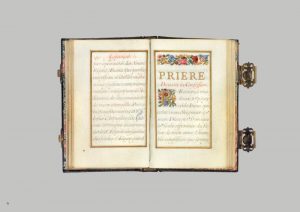 Précieux manuscrit calligraphié et enluminé sur peau de vélin par Nicolas Jarry (1615-1670), le plus célèbre maître écrivain de son temps. # Noteur de la chapelle de sa Majesté, Jarry ne travaillait que pour le roi, les princes et des notables de haut rang, tels Séguier, Richelieu, Fouquet, etc. Sa production, qui se compose essentiellement d'ouvrages de liturgie et de dévotion, fut très prisée et recherchée des bibliophiles du XVIIe siècle à nos jours. On lui doit aussi un chef-d'œuvre profane, la fameuse Guirlande de Julie, dont il calligraphia, sur l'ordre du duc de Montausier, les soixante et un madrigaux composés en l'honneur de Julie d'Angennes. # Selon Debure, « le fameux Jarry, qui n'a pas eu encore son égal en l'art d'écrire, a poussé la beauté de son art jusqu'à la perfection ». Et le baron Portalis écrit : « parvenue à ce degré de perfection, la calligraphie devient de l'art, et lorsqu'à la beauté de la lettre viennent se joindre l'éclat des ors, la gaîté des encres diversement colorées [...], le manuscrit de Jarry donne la sensation d'un objet infiniment précieux dans sa perfection ». # Le présent manuscrit, de petit format, est calligraphié en petits caractères ronds tracés avec beaucoup de finesse. Il est décoré de trois bandeaux de fleurs miniaturés, d'une exquise délicatesse de coloris, et de trois lettrines fleuries dorées à l'or fin, en tête des Prieres chrestiennes (p. 1), des Prieres pour le soir (p. 29) et des Prieres devant la confession (p. 41). Le titre est écrit en rouge et en doré, les titres courants en rouge, les majuscules du texte sont rubriquées en bleu, rouge ou doré et toutes les pages sont encadrées d'un filet doré. # L'ouvrage contient : Prieres chrestiennes (pp. 1-14), Litanies du S. Nom de Jesus (pp. 15-28), Prières pour le soir (pp. 29-30), Litanies de la Vierge (pp. 30-40), Prières devant la confession (pp. 41-48), Prières après la confession (pp. 48-50), Oraison devant la communion (pp. 50-57), Oraison après la communion (pp. 57-62), Le Chemin de la vertu (pp. 62-82), suivi de la souscription : M. de Saint Thomas. # Il est demeuré inconnu à Portalis, dont le Catalogue des manuscrits de Nicolas Jarry décrit pourtant 110 manuscrits exécutés par le maître écrivain, et ne figure pas davantage dans le census fourni par Brunet. # Ce charmant petit volume, relié à l'époque en galuchat noir à fermoirs, fut offert au début du xixe siècle à Marie-Caroline de Bourbon-Siciles (1798-1870), duchesse de Berry, pour sa fille Louise d'Artois (1819-1864), future duchesse de Parme et de Plaisance, avec cet ex-dono calligraphié sur la première garde : Offert le 29 Décembre 1820 à S. A. R. Madame la Duchesse de Berry pour S. A. R. Mademoiselle. Par leur très humble et très obéissant et très dévoué serviteur Gérard Jacob, de Rheims. # Gérard Jacob, issu d'une famille de marchands rémois, consacra une partie de sa vie à d'érudites recherches sur la numismatique et l'archéologie. Collectionneur et bibliophile, il réunit une importante bibliothèque dont ce manuscrit de Jarry faisait sans doute partie, à moins qu'il ne l'eût acquis spécialement pour l'offrir à la duchesse de Berry à l'intention de sa fille première née, alors âgée d'un an. Le coffret aux armes de la duchesse de Berry fut certainement réalisé à l'occasion de cet hommage princier. # Séduisant exemplaire de toute fraîcheur. # Courte fente sur un mors. # Brunet, III, 511-515 et Suppl., I, 692-693 (titre non cité) – Portalis, « Nicolas Jarry et la calligraphie au XVIIe siècle », Bulletin du bibliophile, 1896, pp. 511-521, 565-578, 634-646.