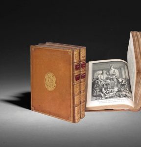 La plus luxueuse édition ancienne des œuvres de Rabelais. # L'édition critique de Jacob Le Duchat, d'abord parue à Amsterdam en 1711, demeura longtemps l'édition de référence des œuvres de Rabelais. # L'illustration, en premier tirage, comprend un portrait de Rabelais par Tanjé au premier tome, un frontispice allégorique dessiné et gravé par Folkema au deuxième tome, un titre gravé par Bernard Picart répété au premier et au troisième tome (l'épreuve du premier tome manque à l'exemplaire), douze figures hors texte de Du Bourg gravées par Bernaerts, Folkema et Tanjé, plus une pour la Bouteille, trois vues de la Devinière et une carte du Chinonais repliées, ainsi que douze vignettes en-tête, douze culs-de-lampe et trois fleurons sur les titres, dont un répété, par Bernard Picart. # Séduisante reliure en maroquin citron aux armes du comte de Calenberg (1773, n°958). # Le comte Henri Reinecke de Calenberg (1685-1772) était prévôt de Meissen, grand maître d'artillerie et chambellan de l’empereur. En 1754, il vint s’installer à Bruxelles, où il réunit une importante collection de livres, de tableaux et d’estampes, qui fut dispersée après sa mort, le 26 avril 1773. Son catalogue décrit le présent ouvrage comme un « magnifique exemplaire ». # Des bibliothèques Charles Cousin (1891, n°488), dit Le Toqué, illustre collectionneur et Grand maître de l’Orient de France de 1883 à 1885, avec ex-libris, et de la princesse de Faucigny-Lucinge (pas au catalogue de 1918), avec ex-libris manuscrit sur les gardes. Le dessin original du frontispice dont Charles Cousin avait enrichi son exemplaire en a été ultérieurement retiré. # Rare en maroquin aux armes. # Menus frottements sur les mors, coins restaurés. Des rousseurs, comme souvent dans cet ouvrage. # Cohen, 839-842 – Tchemerzine, V, 319 – Rahir, 599.