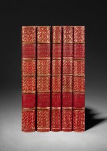 Glanures d'histoire naturelle, consistant en figures de quadrupèdes, d'oiseaux, d'insectes, de plantes, &c. dont on n'avoit point encore eu, pour la plus part, de desseins, ou d'explications... Et traduit de l'Anglois par J. Du Plessis. Ibid., id., 1758-1764. (3 vol.). Ensemble 7 tomes en 5 volumes in-4 (291 x 228 mm), maroquin rouge à long grain, roulette de feuilles de chêne et double filet dorés, dos orné à la grotesque, coupes ornées, roulette intérieure dorée, tranches dorées (Reliure anglaise de l'époque).
