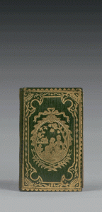 In-16, maroq. vert, plats couverts de dent. d'encadr., éventails d'angles, fil. droits et courbes, médaillon central doré serti de branches de feuillage et noeud de ruban, dos orné, gardes de papier vert et violet dor., tr. dor. (Rel. de l'époque).