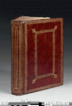 Maroquin rouge, le dos lisse à dentelles, les plats ornés d'un double encadrement de dentelles avec fleurons d'angle; filets dorés sur les coupes, tranches dorées.