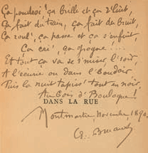 Le premier volume est enrichi d'un faux-titre d'un ex. sur vélin avec CHANSON AUTOGRAPHE SIGNÉE (Au Bois de Boulogne), au second volume on a ajouté une étude sur Bruant par O. Méténier (1893), avec couv ill. par Lautrec et dessins de Steinlen. - On a joint un troisième volume de «Dans la rue», avec illustrations de Poulbot, reliure identique, un des 50x. sur japon.
