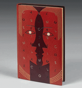 In-8 rel. maroq. rouge, dos et plats décorés de lettres noires, or et argent composant le nom de l'auteur et le titre de l'ouvrage, motif mosaïq. sur le Ier plat, gardes de box et soie, tête dor., non rogn., couv. et dos cons., étui à chemise (Robert Bonfils).