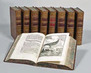Histoire naturelle des oiseaux , 1770-1783, in-4. Imprimerie Royale à Paris. 9 tomes en 9 volumes. Illustré de nombreuses gravures représentant les espèces d’oiseaux répertoriées. Belle reliure en basane marbrée, dos ornés de fleurons dorés, pièces de titre et de tomaison en basane rouge. Chaque volume est conservé sous un emboîtage cartonné individuel.