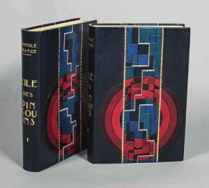 L’île des pingouins , 1926, in-4. Chez Lapina à Paris. En 2 volumes. Illustré de 20 pointes-sèches originales hors-texte et de 131 dessins gravés sur bois en couleurs dans le texte par Louis Jou. Tirage limité à 500 exemplaires. Exceptionnelle reliure en cuir bleu nuit à décor géométrique coloré incrusté de deux bandes mosaïquées. Les deux volumes sont conservés dans un étui commun.