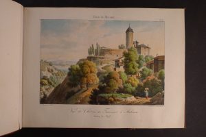 Beau recueil de 43 lithographies d'après les dessins de Constant Bourgeois et de Villeneuve, superbement rehaussées à l'époque. 29 lithographies sont d'après les dessins de Constant Bourgeois (1767-1841) peintre, lithographe, dessinateur et graveur, qui fût l'élève de David. Bourgeois devient peintre d'histoire et surtout de paysages, contemporains ou historiques et aime particulièrement la peinture de paysages ; Bourgeois est parmi les premiers peintres de panorama. 14 lithographies sont d'après les dessins de Jules-Louis-Frédéric Villeneuve (1796-1842), illustrateur français, qui a notamment publié un ensemble de cinq volumes portant le titre "Lettres sur la Suisse", dont les lithographies de notre recueil sont issues.