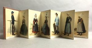26 gravures au format carte postale montées en accordéon, demi-toile rouge de l'éditeur, plat de percaline orangé imprimé or (mors fendus,). Unique édition de cette série de 25 lithographies rehaussées montrant les costumes, principalement de femmes (23), de BasseNormandie : femme d'Octeville, de Fermanville, fermière de Sottevast, laitière de Cherbourg, femme de Valogne, riche fermière de Bayeux, femme de Lisieux, des environs de Caen, servante du Calvados, cantonnière de chemin de fer, deux femmes de Granville, femme de Coutances, de Pontorson, d'Avranches, de Saint-Aubin, de Vire, etc. Sur le second contreplat, une dédicace, en anglais, datée du 14 septembre 1860, "Evelyne Isabelle Barton. from her dearest mama, a souvenir of women." ; sur le premier contreplat, l'ex-libris moderne de François Cottin de Lisieux. Petit cachet de la collection Monmélien. Ensemble piqué.