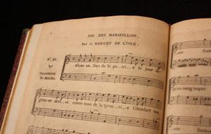 Le 10 janvier 1794, Bernard Sarette, capitaine de la Garde Nationale proposa au Comité d'Instruction publique de créer une association regroupant les musiciens de son Institution et les membres de l'Institut national de musique dans le but d'imprimer puis de diffuser dans les différents districts de France, des hymnes qui seraient joués et chantés au moment de la célébration des fêtes nationales. Pour ce faire, elle enverrait une publication de 50 à 60 pages tous les mois. Le projet plut à l'assemblée qui décida d'accorder à l'association un local, rue St Joseph. Le Comité de Salut Publique lui, leur remit une partie de la Trésorerie Française pour les aider dans leur tâche. L'association comprenait différents compositeurs tels que Gossec, Mehul et Catel. Cependant, le 7 Mai 1794, Robespierre prononça un discours sur le rapport des idées religieuses et morales avec les idées républicaines. A la suite de ce dernier, un décret fut adopté demandant à tous les poètes et artistes de participer à la conception des chants pour célébrer les fêtes nationales. Peu de temps après l'association et le Comité décidèrent d'envoyer les publications aux différentes armées afin de propager l'amour de la République et des vertus publiques. Le format passa de l'in quarto à l'in octavo. Étant donné l'étroitesse du local, le 24 Juillet, le Comité de Salut Publique leur accorda un autre bâtiment situé rue des Fossés Montmartre mais la société ne s'y installa qu'au mois d'Octobre avant de déménager de nouveau au Conservatoire en 1797. En 1795, le compositeur Luigi Cherubini y entra en tant qu'inspecteur avant de devenir directeur de la structure en1822. Exemplaire unique contenant une mise en recueil de différents avec paroles et partitions parus sous la Révolution. A partir de 1793, la France entre en guerre contre les autres monarchies étrangères. De ce fait, la majorité des chants diffusés sont des hymnes guerriers servant à conserver au sein des armées un sentiment fort de patriotisme, mêlé aux valeurs républicaines. Différentes odes du recueil appartiennent à cette catégorie : - Chanson patriotique sur le succès de nos armes par Coupigny. Musique de Gossec. - Hymne à la Victoire par Coupigny. Musique de Gossec. - Stances chantées pour la fête des élèves, pour la fabrication des canons, poudre et salpêtre. Par Pilet. Musique de Catel. - Ode à l'armée française par Le Sur. Musique de L. Jadin. - Le chant du départ. Hymne de Guerre. Musique de Méhul. - Le Chant des Victoires. Hymne de Guerre par Chénier .Musique de Mehul. et le célèbre Air des Marseillois ; par Jacques Rouget de Lisle. - Hymne à la Victoire par Flins. Musique de Cherubini. - Chant Martial pour la Fête de la Victoire par Lachabeaussière. Musique de Gossec. - Chant du banquet républicain pour la fête de la victoire par Lebrun. Musique de Catel. - Hymne à la victoire par Coupigny. Musique de Gossec. Par la célébration des fêtes nationales et le rassemblement de tous les citoyens d'une commune pour chanter des chants nationaux, le gouvernement français chercha à développer des sentiments patriotiques au sein de la population locale et à créer une identité nationale. En effet, certaines odes renvoient aux martyrs révolutionnaires tels que Barra ou Marat ou célèbrent des dates importantes de cette période historique. Aussi, ces chants permettent de partager une Histoire nationale. - Chant Patriotique pour l'inauguration des bustes de Marat et de Lepelletier par Coupigny. Musique de Gossec. - Hymne à la Victoire sur la Bataille de Fleurus par Lebrun. Musique de Catel. - Hymne chanté par le peuple à la fête de Barra et Viala par Davrigny. Musique de Mehul. - Hymne du IX Thermidor par Chénier. Musique de Méhul. - Chant pour l'anniversaire de la fondation de la République Française par Amalric. Musique de Catel. - Le chant du 14 Juillet par Chénier. Musique de Gossec. - Hymne a l'Humanité en mémoire du IX Thermidor par Baour Lormian. Musique de Gossec. - Hymne Funèbre sur la mort du Général Hoche par Chénier. Musique de Cherubini. La diffusion des hymnes est également un moyen de transmission et de célébration des valeurs et des idées républicaines, certaines étant fondamentales car elles ont données naissance à la Révolution puis à la République. Parmi cette classe, se trouvent - Hymne à la Liberté, chant de Triomphe par Baour Lormian. Musique de Rigel Père. - Hymne à Jean Jacques Rousseau par Chénier. Musique de Gossec. A travers son œuvre le Contrat Social le philosophe expose les notions de démocratie et de souveraineté du peuple. Idées qui seront reprises notamment lors de la rédaction de la déclaration des droits de l'homme et du citoyen et par différents révolutionnaires tels que Robespierre ou Saint-Just. - Hymne à l'Être Suprême par Desorgues. Musique de Gossec Le 26 juin 1793, Joseph Lakanal député de la Convention présenta un plan d'éducation nationale au nom du Comité d'Instruction publique. Certains articles concernaient l'établissement des fêtes nationales dans toutes les subdivisions de la France. Celles-ci faisaient références la Révolution Française, à la société humaine et aux époques de l'année. Parmi ces deux dernières catégories, se trouvait entre autre la fête de l'agriculture célébrée le 10 messidor au moment des moissons et la fêtes de vieillards. Certains chants du recueil renvoient à ces fêtes : - Hymne à l'agriculture par la citoyenne Pipelet. Musique de Martini. - Hymne pour la fête de l'agriculture par Lebrun. Musique de Berton. - Chanson pour la Fête de l'Agriculture par Lachabeaussière. Musique de Jadin. - Hymne à l'Agriculture par Coupigny. Musique de Lefevre. - Chant pour la fête de la vieillesse par Desorgues. Musique de Gossec.