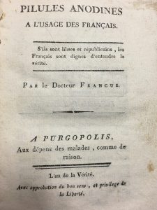 [RÉVOLUTION FRANÇAISE]. FRANCUS (Dr.) Pilules anodines à l'usage des Français. A Purgopolis, aux dépens des malades, comme de raison, l'an de la vérité [1789 ?].