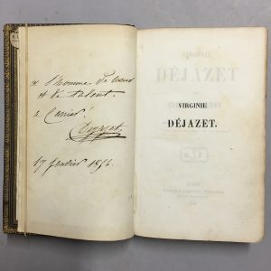 Sur la première garde, un envoi autographe signé de Virginie Déjazet, daté du 17 janvier 1856, à un destinataire non identifié : " à l'homme de cœur et de talent ".