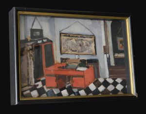 Peinture de la première période, bureau occupé par un meuble rouge sobrement rangé avec un encrier, on distingue 3 tableaux accrochés aux murs, le sol est un damier noir et blanc (motif qui revient souvent dans l'œuvre de Baes).
