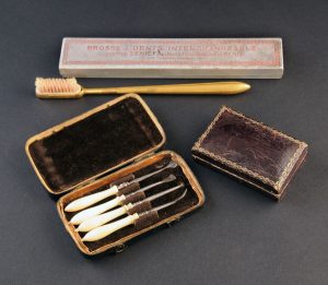 - 2 trousses à détartrage et 2 brosses à dents. Composé de 2 trousses à détartrage. France. Une du XVIIIe siècle présente un étui gainé de chagrin noir et velours noir à l'intérieur. On compte quatre instruments avec manches en ivoire, dont un n'est pas de même facture. La deuxième trousse du XIXe, plus petite, se compose d'un étui en bois recouvert de maroquin à grain long. Du velours vert tapisse l'intérieur ainsi qu'un miroir d'origine, à encadrement orné. L'ensemble comporte huit rugines avec manche en ivoire tourné. Cet élégant petit nécessaire d'hygiène dentaire était utilisable par des non-praticiens de l'Art Dentaire pour l'entretien courant et les nettoyages de bouches ; et d'1ravissante brosse à dent interchangeable, avec un manche en métal doré, Paris, Docteur Lenief ; la brosse en os et crins, début XXe. Elle est conservée dans sa boîte d'origine en aluminium. Le mode d'emploi est encollé sur le couvercle.