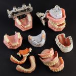 - 8 dentiers et 2 supports. Résine, cire, vulcanite, plâtre, acier. XXe siècle.
