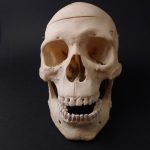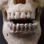 - 1 crâne préparé avec ressorts pour maintenir la mandibule et calotte crânienne démontable maintenue par des crochets, crâne très propre, les dents ont été curieusement plâtrées