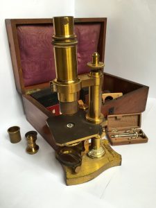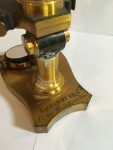 Microscope Nachet petit modèle droit en laiton, signé au socle : "Nachet et Fils, 17, rue Saint Séverin, Paris" CIRCA 1886, corps inclinable, mise au point par crémaillère, vis micrométrique, miroir mobile. Conservé dans son coffret d'origine en acajou avec oculaires et objectifs supplémentaires.