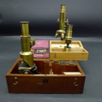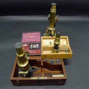 Signés, en laiton avec optiques dont 2 dans leur coffret et boite d'origine : Hayam et Nachet, Stiassnie, Paris, Nachet et fils, Paris.