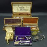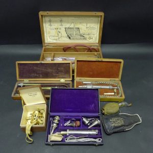 VARIA. - 1 pulvérisateur contre l'asthme dans son étui en cuir. - 1 coffret avec otoscope avec son nécessaire - 1 rectificateur Nice Nose, - 1 pneumostat du professeur A. Jousset dans sa boîte - 2 clysopompes.