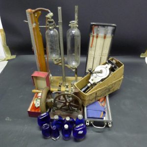 VARIA. Dont un appareil pour la tension artérielle, une presse Ernst Leitz, deux modèles " PULSOCONN " du Dr Macaura, un appareil de médecine et de chirurgie de Maurice Lesquins, ceinture électrique La Souveraine du Dr De Bellama et huit flacons...