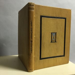 In-8 carré, 59, (5) pages, reliure pleine peau de couleur sable, dos lisse, auteur et date en brun soulignés d'un filet argenté, titre en long de même, plat supérieur orné du motif d'un sablier mosaïqué en argent et or entouré d'un cadre mosaïqué noir, contreplats bordés de maroquin mosaïqué, double garde marbrée, couv. sup. conservée [S. Saintu] (coiffes et coins frottés).