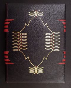 Fort et grand in-4, [2] feuillets, 348-[5] pages, maroquin noir, dos orné de 4 faux nerfs d'épaisseur variable et mosaïqués de rouge, plats décorés d'une composition Art déco formée de filets dorés et de pastilles mosaïquées, tranches dorées sur témoins, contreplats et gardes garnis de moire rouge, doubles gardes de papier peint orné de trèfles verts, couvertures et dos conservés ; chemise demi-chagrin vert foncé à bandes et étui cartonné couverts du même papier aux trèfles [Franz].